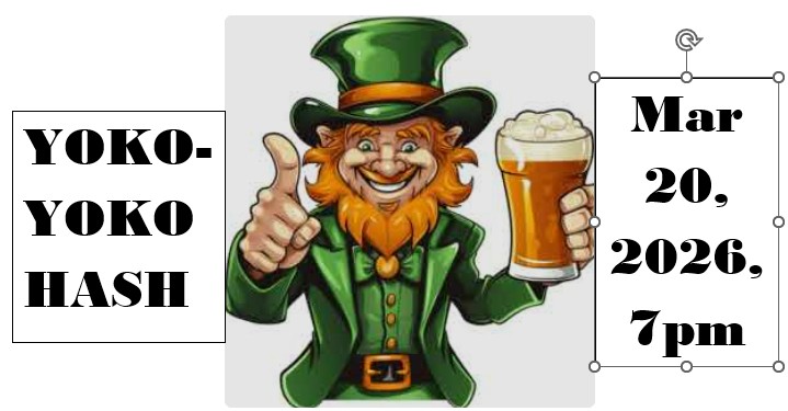 Yoko Yoko Hash, St. Patrick's Hash Friday, March 20, 2026 - 7:00 PM WHAT: Yoko Yoko Hash - A-B Live HARE!!! When: Mar. 20 2026, 7pm Theme: St. Patrick's Day Where: YRP Nobi Station, follow arrows Hare: Gerbil Stuffer Requirements: Bring a flashlight, there are some dark areas. There is also an adult beverage vending machine with some sort of ID scanner on it, so bring an ID and Yen if you want a trail drink. |